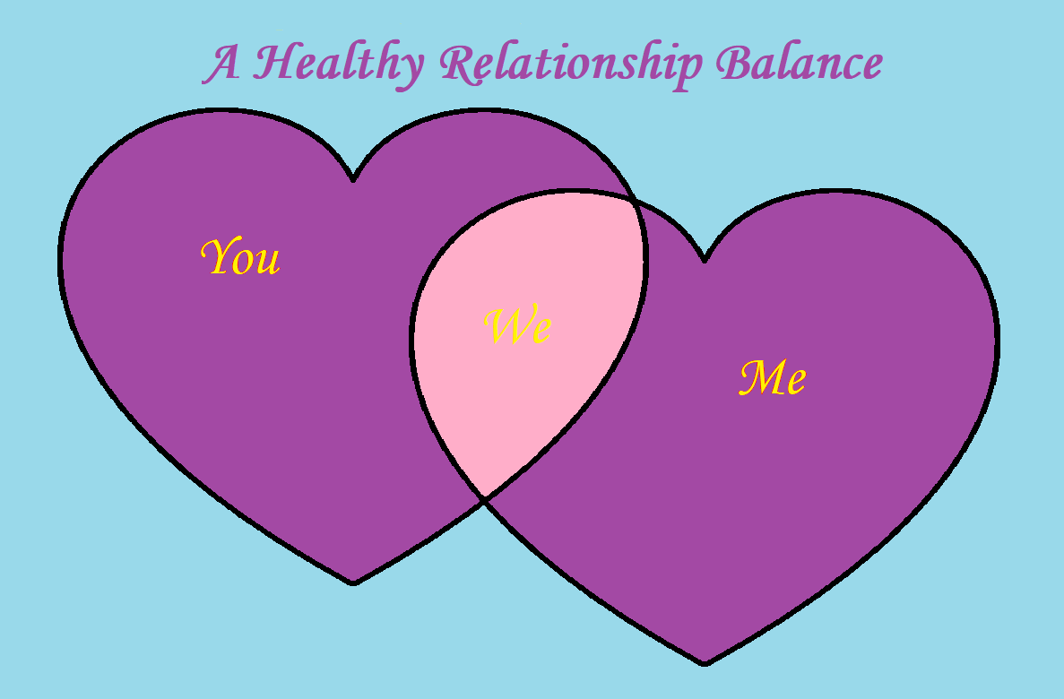 A Healthy Relationship Balance exists in the pink where WE come together but only if there is a respectful and encouraged Purple individuality that we honor and celebrate in each other. The Purple YOU and the Purple ME represent our individual lives and the Pink WE is where we share a portion of OUR lives in the blissful union of a loving, respectful and supportive relationship.